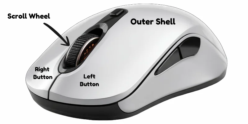 In this article, we discussed the main external parts of a mouse, such as the left button, right button, scroll wheel, and body, along with important internal parts like the microcontroller, circuit board, switches, and LED or laser light.